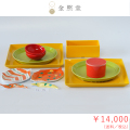 ビビットなカラーのセットです。朝食やランチのワンプレートにもできる黄色い角皿は、元気が出ますね。葉っぱの柄は、紅葉の頃コーディネートに使っても。