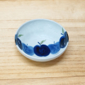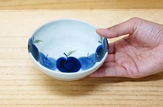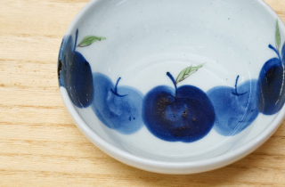デザートのヨーグルトやアイス、タレ入れなどに活躍してくれそうな小付。 りんごの絵柄も少しグレーがかった染付なので、カジュアルになりすぎず落ち着いた雰囲気です。 お揃いの楕円皿やラーメン鉢とのセットづかいもおすすめ。 ※手描きですのでひとつひとつ呉須の濃淡が若干ちがいます。予めご了承ください。