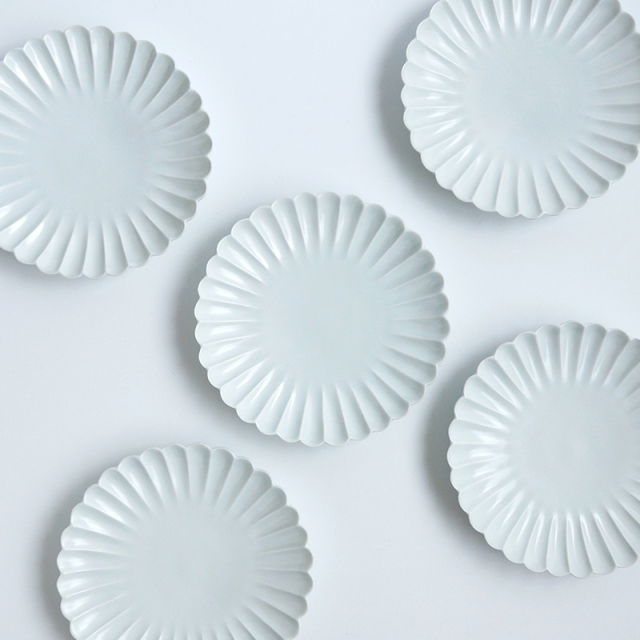 【洸琳窯】 マットな釉薬で仕上げた菊の花型の5寸皿です。シンプルなデザインなのでケーキ皿としてデザートタイムに、取り皿としてディナータイムにと和洋どちらにもどんなお料理にも合わせられます。とても使いやすいサイズで、重なりもよいので何枚あってもいいですね。
